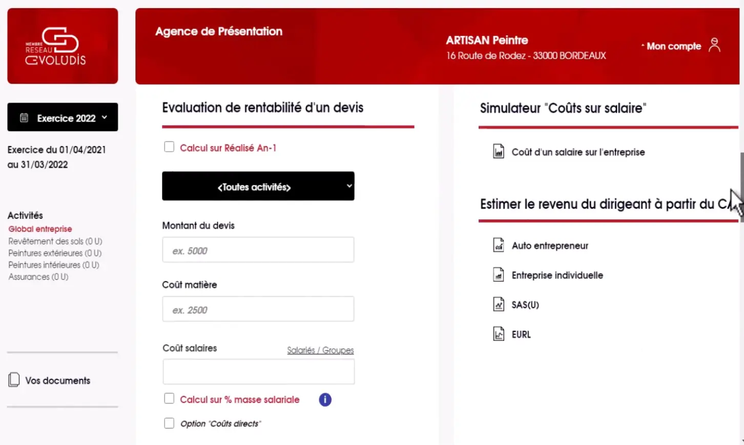 Avec nos simulateurs, terminés ces calculs complexes, rien de plus simple, en quelques minutes vous savez parfaitement si vos devis ou recettes vous permettent d’atteindre vos objectifs de rentabilité.